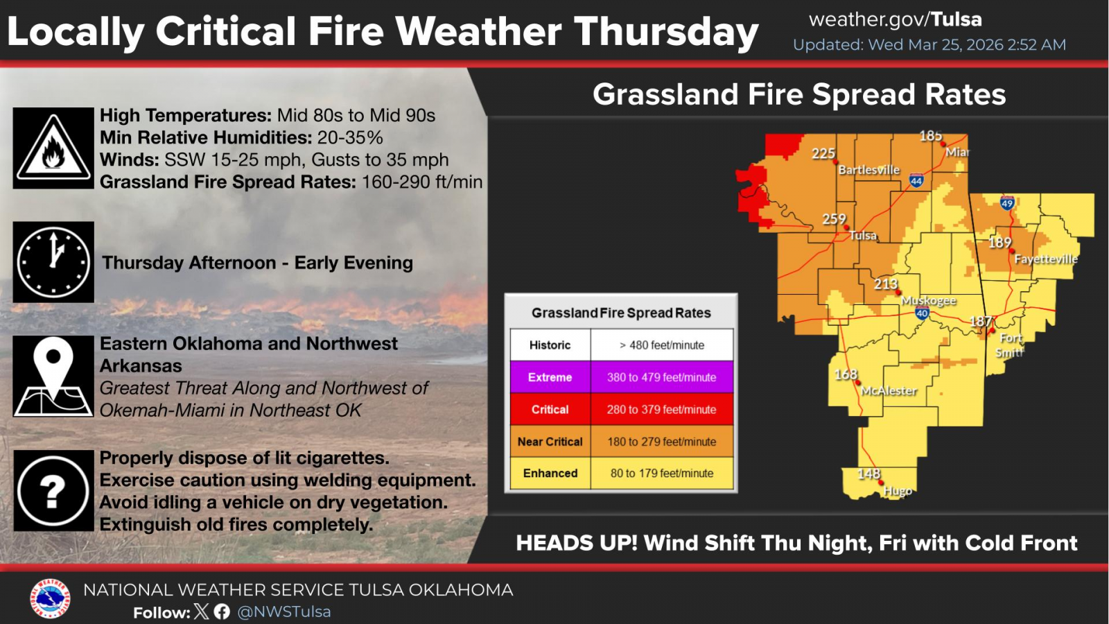 This will result in near-critical fire spread rates across much of the area, with locally critical spread rates possible in Osage and Pawnee counties. The highest risk areas are west of Highway 75.