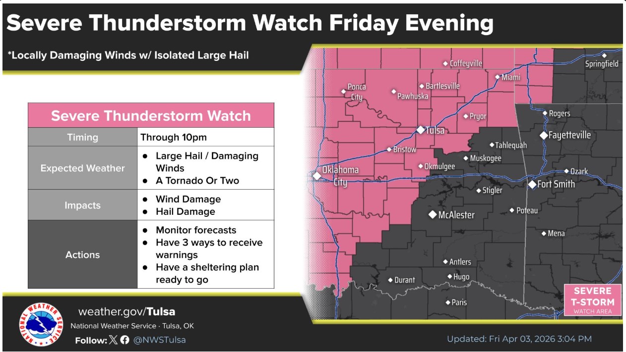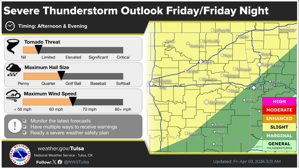 Overnight into Saturday, heavier rains are expected in Southeastern Oklahoma before a coldfront moves in. Temperatures Saturday morning range between the upper 40s and low 50s for the listening area.